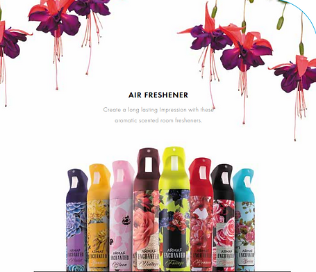 Armaf air fresheners are designed to eliminate odors and revitalize spaces with long-lasting, high-quality fragrances, creating a pleasant and fresh atmosphere. Available in various scents, such as Enchanted Lemon for an energizing citrus aroma, Enchanted Oud for a luxurious woodsy scent, or Enchanted Spring for a floral and fruity experience, these air fresheners are suitable for rooms, cars, and textiles. The brand emphasizes the importance of scent in daily life, offering a range of products known for their potent formulas and elegant packaging to leave a lasting positive impression.