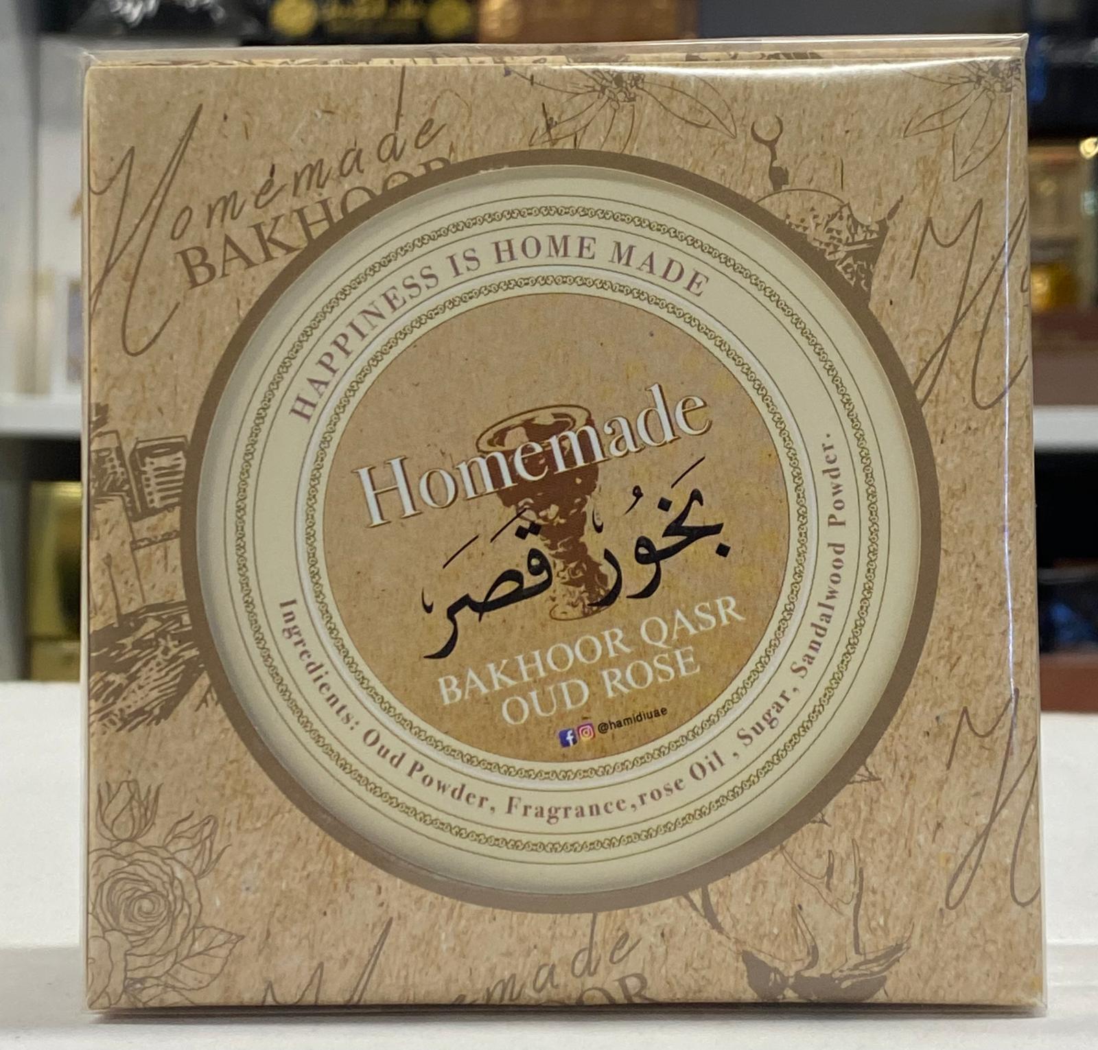 Homemade Bakhoor Qasr Oud Rose by Hamidi is a luxurious incense blend that harmonizes the romantic essence of rose with the depth of oud and musk, creating a serene and elegant atmosphere.