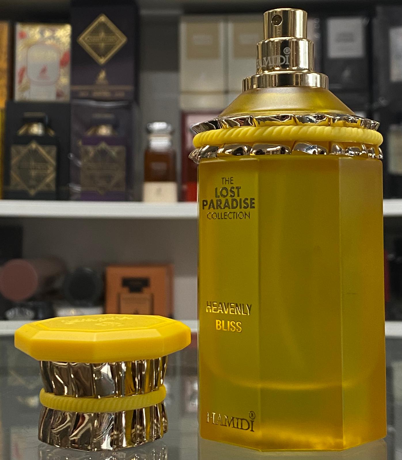 Hamidi The Lost Paradise Heavenly Bliss is a radiant, uplifting Eau de Parfum that captures the essence of serenity and soft luxury. This fragrance opens with a bright, airy blend of fruits and florals that instantly feels comforting and inviting. As it develops, creamy florals and warm amber emerge, creating a smooth, velvety heart. The dry‑down settles into a gentle base of musk and soft woods, giving the scent a clean, elegant finish that lingers beautifully.